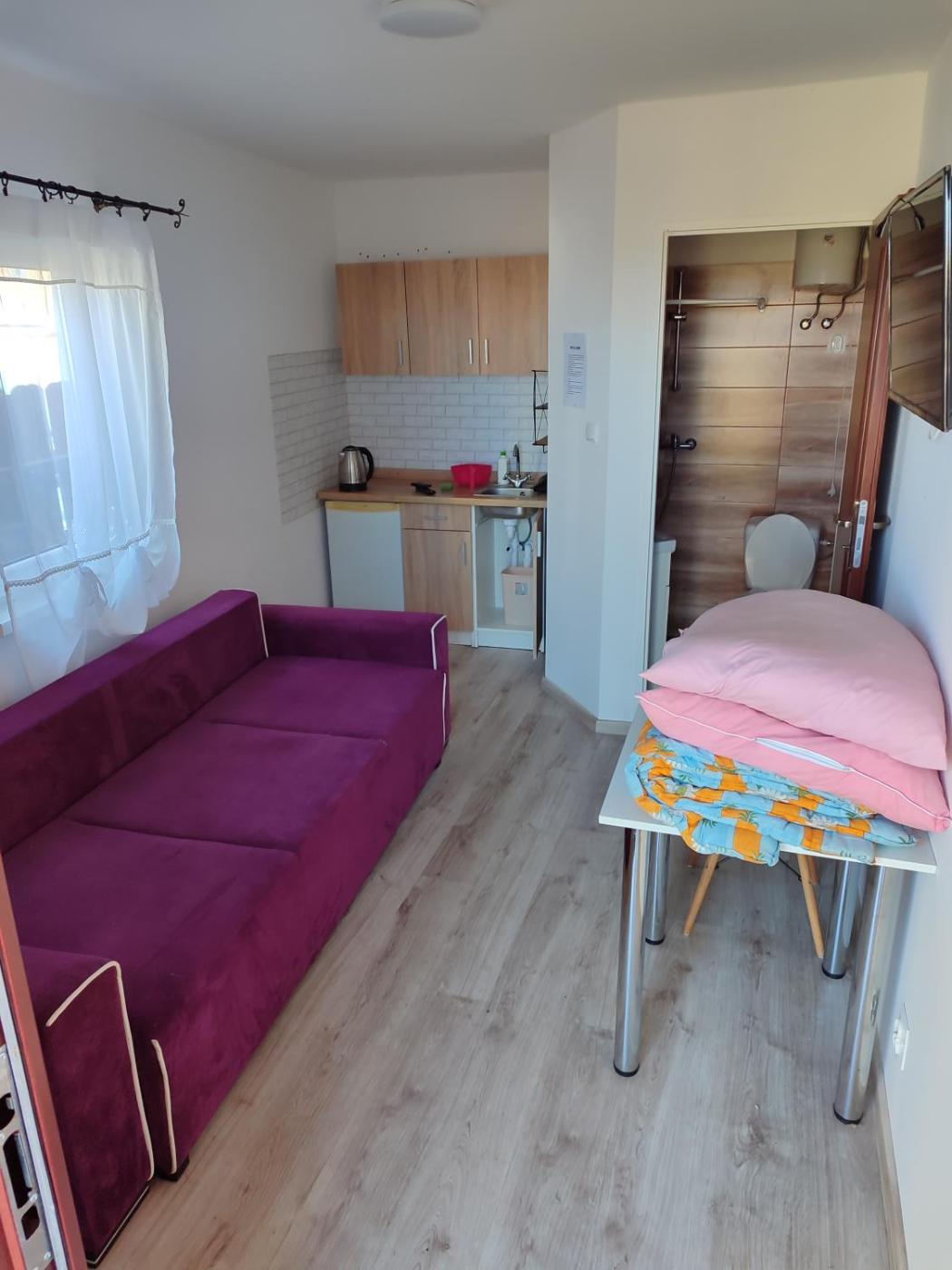 Domek. The chalet features a private entrance, a seating area, as well as a private bathroom boasting a shower. Guests will find a stovetop, a refrigerator and kitchenware in the kitchenette. The chalet also includes a barbecue. A sofa, a flat-screen TV, a wardrobe and outdoor furniture are available in this chalet. The unit has 1 bed. Domek - 2 osobowy. Powierzchnia pokoju ok.: 14 mkw.