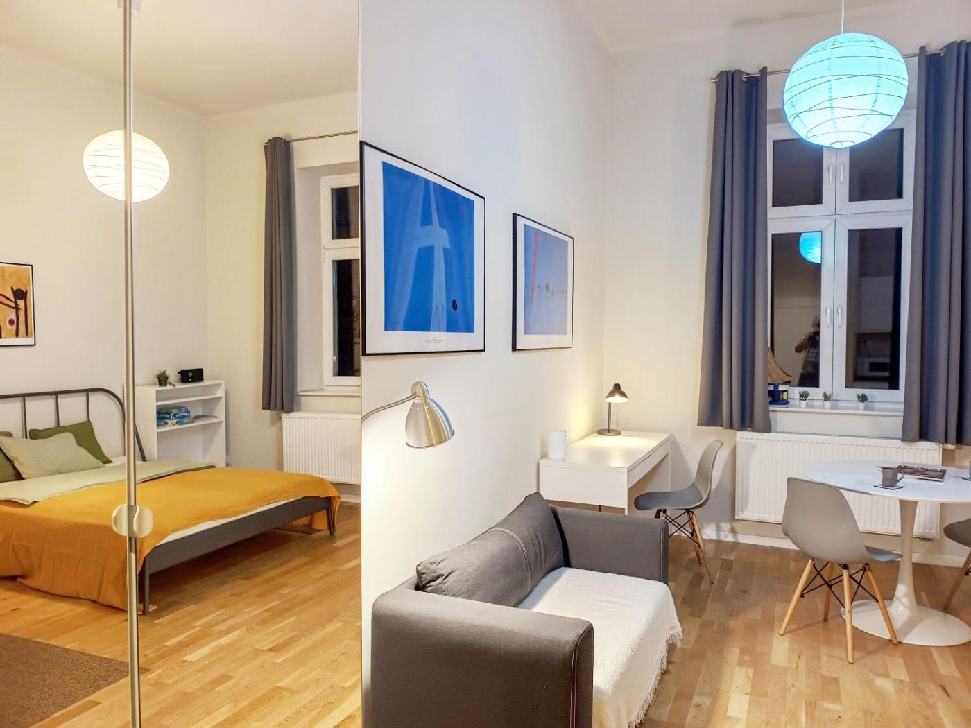 Studio z łóżkiem typu queen-size. Guests can make meals in the kitchen that features a stovetop, a refrigerator, kitchenware and a microwave. The studio features a washing machine, a tea and coffee maker, as well as a private bathroom boasting a shower and a hairdryer. The unit has 2 beds. Studio - 3 osobowy. Powierzchnia pokoju ok.: 30 mkw.